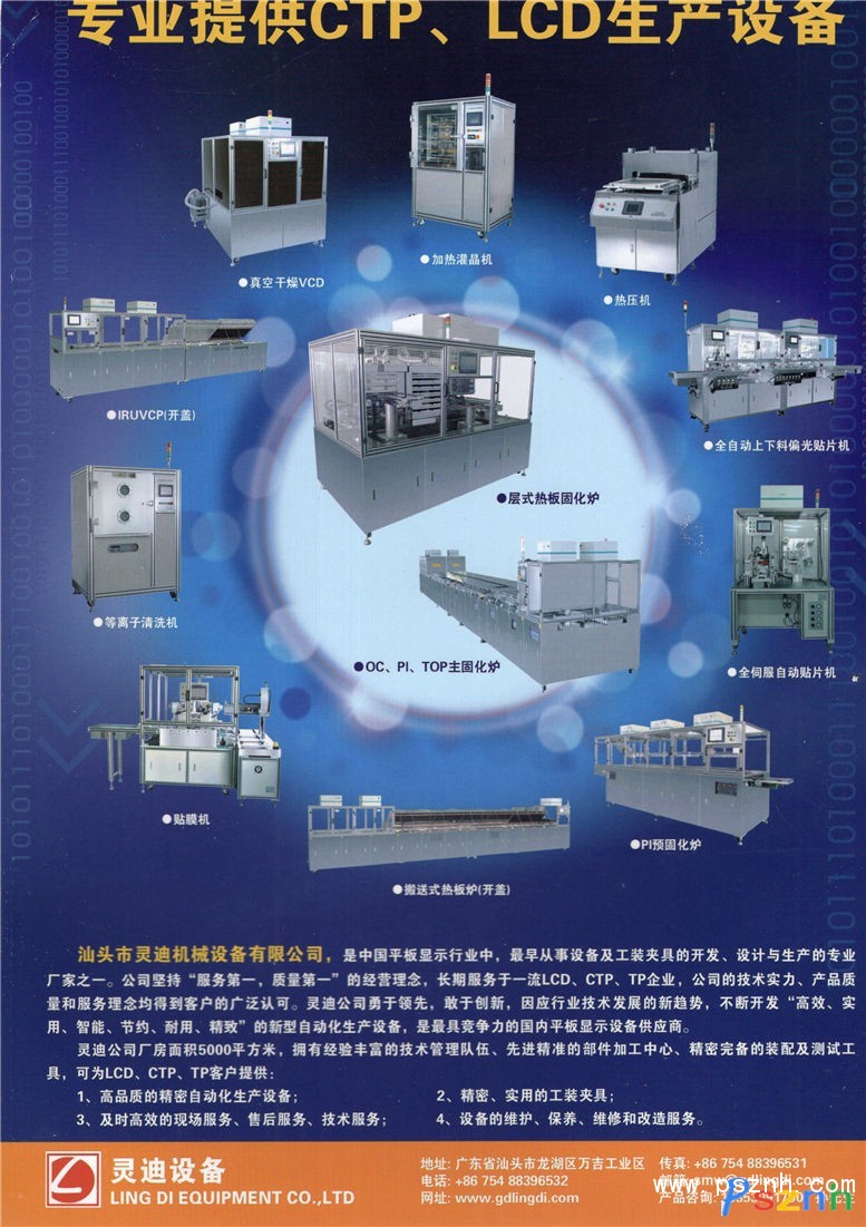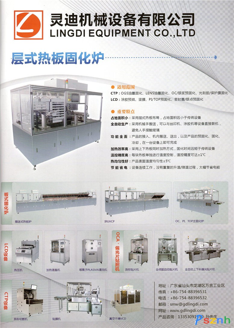 靈迪機械設備有限公司是集研發(fā)、制造、銷售、服務為一體的高新設備制造廠家。公司擁有多年CTP/LCD/TP行業(yè)設備制造經(jīng)驗,以滿足用戶要求為宗旨,不斷吸收創(chuàng)新,保持先進性,保證設備實用、穩(wěn)定、高效,為各企業(yè)在提高產(chǎn)品質(zhì)量、產(chǎn)能及降低成本等方面都取得明顯效益。