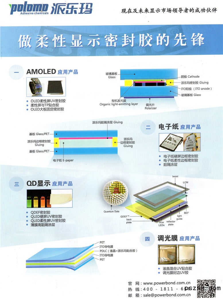 派樂(lè)瑪專注于光電顯示器件制程密封膠,及其材料創(chuàng)新技術(shù)解決方案的提供,特別是在UV光固化技術(shù)領(lǐng)域,派樂(lè)瑪是國(guó)內(nèi)同業(yè)領(lǐng)先企業(yè)。公司秉承“以化學(xué)技術(shù)持續(xù)創(chuàng)新推動(dòng)人類進(jìn)步”的企業(yè)使命,深耕于光電顯示領(lǐng)域,并延伸于半導(dǎo)體、微電子部件;智能工業(yè)、汽車;智能家居、建筑領(lǐng)域。核心技術(shù)產(chǎn)品涵蓋了LCD、觸控屏、AMOLED、QDEF、3D顯示、柔性顯示器件、E-Paper,以及其他新型顯示技術(shù)應(yīng)用的粘合、密封材料與解決方案。