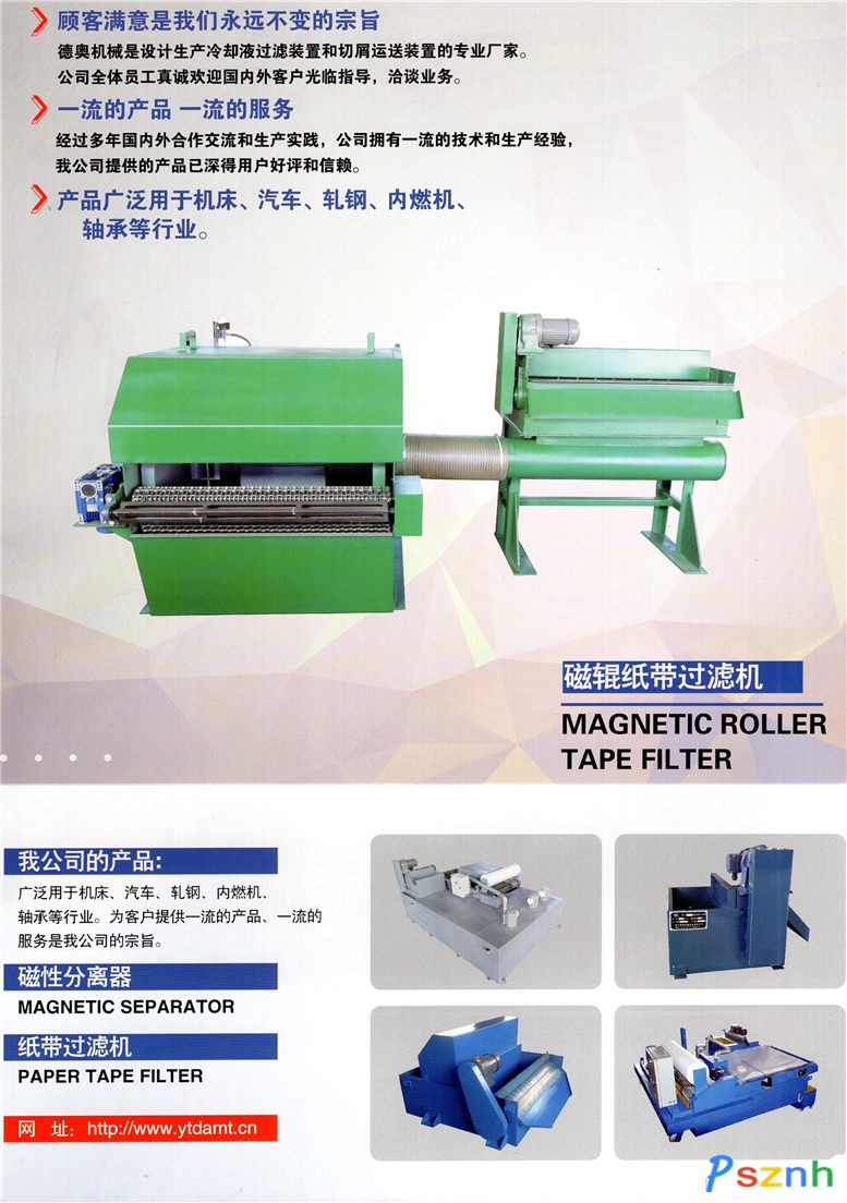 煙臺(tái)德奧機(jī)械設(shè)備有限公司 產(chǎn)品主要有:重力式紙帶過濾機(jī)、圓柱面磁性分離器、梳齒磁性分離器、鼓形紙帶過濾機(jī)、磁性排屑器、鏈板排屑器、刮板排屑器、旋流器、空氣真空紙帶過濾機(jī)、液體真空紙帶過濾機(jī)、預(yù)涂助濾過濾機(jī)、板式精密紙帶過濾機(jī)、磁棒分離器、反洗濾網(wǎng)筒式過濾機(jī)、螺旋排屑器、 盤式油水分離器、離心過濾機(jī)。是設(shè)計(jì)生產(chǎn)冷卻液過濾裝置和切悄運(yùn)送裝置的專業(yè)廠家。經(jīng)過多年國(guó)內(nèi)外合作交流和生產(chǎn)實(shí)踐,公司擁有一流的技術(shù)和生產(chǎn)經(jīng)驗(yàn),我公司 提供 的產(chǎn)品已深得用戶好評(píng)和信賴。