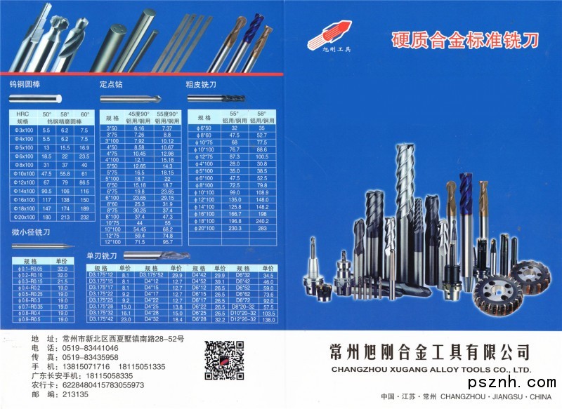 常州旭剛合金工具有限公司是一家商貿(mào)與生產(chǎn)為一體的硬質(zhì)合金刀具專業(yè)公司。有整體硬質(zhì)合金鉆頭,圓棒,立銑刀,鍵槽銑刀,球頭銑刀以及各種規(guī)格刀片, ⑴ 批發(fā)中高檔標(biāo)準(zhǔn)硬質(zhì)合金涂層銑刀,另定做各種非標(biāo)刀具奇難刀具。 ⑵ 批發(fā)中高檔毛坯擠壓圓棒,模壓圓棒的銷售,并有管材,板材,長(zhǎng)條薄片的銷售,另定壓各種非標(biāo)材料棒等,本公司以零價(jià)格批發(fā)。