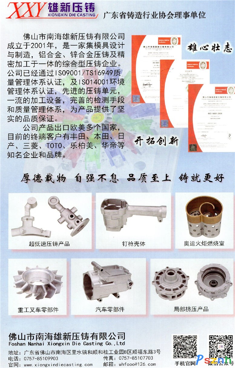 佛山市雄新壓鑄有限公司是位于珠三角地區(qū)的鋁合金、鋅合金(包括:汽車配件、家電配件、風(fēng)動(dòng)工具等)中大型壓鑄企業(yè),2009年擴(kuò)建的工廠座落于佛山市南海區(qū)和桂工業(yè)園B區(qū),設(shè)計(jì)產(chǎn)能為9000噸/年鋁鋅合金壓鑄件。目前年產(chǎn)量達(dá)3000噸以上。公司創(chuàng)立十年來始終堅(jiān)持鑄造工藝技術(shù)的完善和優(yōu)化。廣泛深入地與國內(nèi)外同行進(jìn)行技術(shù)交流與合作,力求精益求精。 我公司還擁有一流的進(jìn)口全自動(dòng)壓鑄設(shè)備,和精準(zhǔn)的檢測(cè)設(shè)備(光譜儀,三次元等)。且建立了從普通壓鑄到液態(tài)模鍛、抽真空、局部擠壓等完善的壓鑄工藝技術(shù)體系。新技術(shù)新工藝的成功運(yùn)用和完善的模具設(shè)計(jì)方案使一些有特殊要求的鑄件有了品質(zhì)保證。 主要生產(chǎn)設(shè)備:冷室壓鑄機(jī)135T-800T共12臺(tái)(東洋、東芝) 主要檢測(cè)設(shè)備:光譜儀、三座標(biāo)、X光探傷儀等。 己通過ISO/TS16949質(zhì)量管理體系認(rèn)證。 廠區(qū)面積:22000平米。 生產(chǎn)車間面積:9000平米。 主營:鋁合金、鋅合金壓鑄件。配有模具設(shè)計(jì)制造。