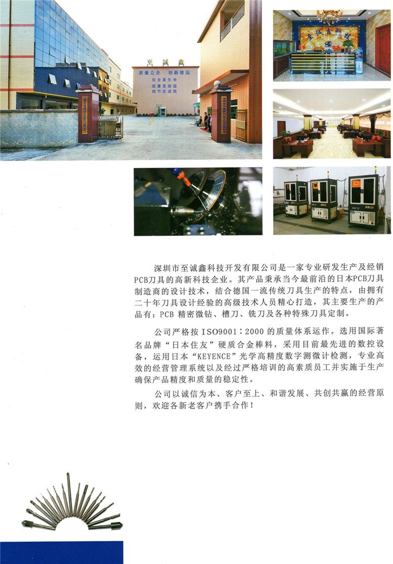 深圳市至誠鑫科技開發(fā)有限公司成立于2003,是一家專業(yè)研發(fā)和生產(chǎn)硬質(zhì)合金高精密PCB專用鉆頭,銑刀,槽刀的高科技企業(yè)。公司所有半成品到成品的各工序,引進(jìn)中國先進(jìn)的微鉆自動(dòng)化生產(chǎn)設(shè)備,自主配備完善了技術(shù)研發(fā)部門,引進(jìn)了行業(yè)最高精度的鐳射全自動(dòng)檢測設(shè)備,完善的品質(zhì)管理系統(tǒng),公司一直以來,堅(jiān)持“科技以人為本,創(chuàng)新創(chuàng)造成功未來”理念。建立一整套來格管理模式。