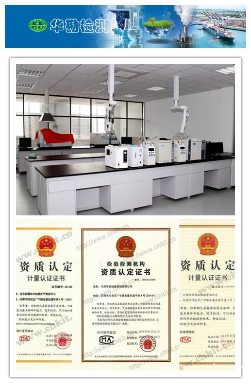 天津華勘檢驗測試有限公司是中國國家認證認可監(jiān)督管理委員會認定的第三方檢測機構(gòu),擁有中國檢驗測試機構(gòu)強制認定資質(zhì)(CMA)、中國合格評定認可委員會(CNAS)認可的實驗室、質(zhì)量管理體系認證資質(zhì)證書、地質(zhì)勘查甲級資質(zhì)證書(巖礦鑒定、巖礦測試和巖土試驗)、國家高新技術(shù)企業(yè)資質(zhì)證書以及進出口商品檢驗鑒定機構(gòu)資格證書等,我公司具備一套完整的第三方檢驗測試資質(zhì)體系。