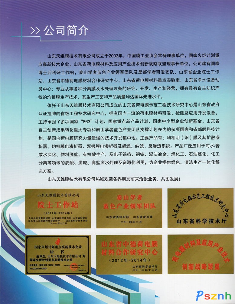 公司牽頭制訂國家化工行業(yè)標(biāo)準(zhǔn)一項,主持承擔(dān)包括二項國家“863”計劃、國家重點新產(chǎn)品計劃、國家中小企業(yè)重點創(chuàng)新基金、山東省自主創(chuàng)新成果轉(zhuǎn)化重大專項和泰山學(xué)者藍(lán)色產(chǎn)業(yè)團(tuán)隊支撐計劃在內(nèi)的多項國家和省部級科技計劃,擁有具有自主知識產(chǎn)權(quán)的均相膜生產(chǎn)技術(shù),系列荷電膜產(chǎn)品已被列入國家戰(zhàn)略計劃中,產(chǎn)品獲得“國家重點新產(chǎn)品”認(rèn)定。主要產(chǎn)品有:均相陰(陽)膜及其擴(kuò)散滲析器、均相膜電滲析器、雙極膜電滲析器及超濾、納濾、反滲透系統(tǒng)。產(chǎn)品廣泛應(yīng)用于海水/苦咸水淡化、物料脫鹽、有機(jī)酸生產(chǎn)及電子鋁箔、鋼鐵、濕法冶金、煤化工、石油煉化、化工分離等領(lǐng)域的廢酸、廢堿、高鹽廢水處理及資源化利用,為企業(yè)提供綠色、清潔生產(chǎn)一體化解決方案。