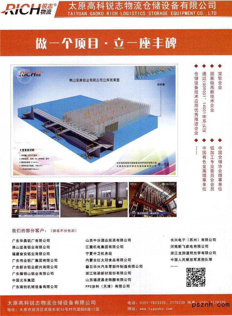 太原高科銳志物流倉儲設(shè)備有限公司具有自主知識產(chǎn)權(quán)的“長件鋁型材生產(chǎn)物流和自動化立體倉庫系統(tǒng)”、“鋁型材模具存取系統(tǒng)”已在鋁型材行業(yè)得到廣泛的應(yīng)用,并獨占該市場份額。