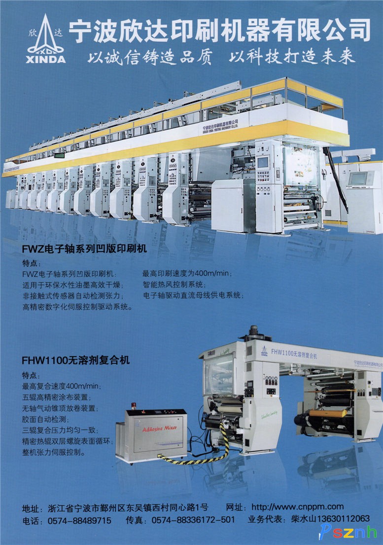寧波欣達印刷機器有限公司位于美麗而充滿活力的濱海城市寧波,屬于寧波欣達集團(有限)公司的全資公司,以先進的技術團隊和國際一流的精密制造裝備和工藝為依托,是專業(yè)研發(fā)和制造高端組合式凹版印刷機與涂布復合設備的國家高新技術企業(yè)。        公司具有ISO9001質量管理體系與ISO14001環(huán)境管理體系資質,2015年通過知識產權體系認證。先后榮獲“重點推廣優(yōu)秀企業(yè)”、“用戶滿意(凹?。┢放?rdquo;等多項榮譽,自主開發(fā)的高速電子軸凹版印刷機榮獲“國家重點新產品”、“浙江省科技進步(二等)獎”和“浙江省產品設計大獎賽金獎”,“高精密涂布設備關鍵技術的研究與產業(yè)化”列入國家十二五科技支撐計劃專題項目并通過圓滿驗收,2015年成功開發(fā)和生產的600m/min電子軸傳動涂布印刷生產線為國內首創(chuàng)并達到國際先進水平。        公司擁有數十名從事技術研發(fā)、產品設計和工藝技術的專業(yè)人才隊伍,持續(xù)地進行核心技術經驗的傳承和不斷創(chuàng)新,持之以恒地研究和集成應用環(huán)保與節(jié)能新技術,在凹版印刷和涂布復合設備的技術領域取得發(fā)明及實用新型專利近百項;公司負責和參與起草《卷筒材料凹版印刷機》、《卷筒料復合機》、《卷筒料凹版印刷機能耗測試方法》等十幾項重要的國家和行業(yè)標準,榮獲“全國印刷機械標準化技術委員會先進單位”。       從德國、美國、日本和意大利進口的幾十臺加工中心和精密檢測設備,用于產品主關零件的制造生產,加工精度和質量水平達到國際一流的水準,使產品的質量與性能品質得到可靠保證。       寧波欣達堅持“誠信為本、創(chuàng)新為魂,打造百年欣達”的企業(yè)發(fā)展理念,竭盡全力為客戶提供貼心的服務和有力的技術支持,把為用戶創(chuàng)造效益最大化為己任,追求合作與共贏。