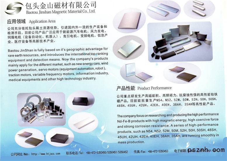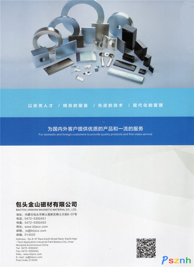 包頭金山磁材有限公司位于中國內(nèi)蒙古包頭稀土高新區(qū)稀土應用產(chǎn)業(yè)園區(qū),占地面積100畝,注冊資金1.25億元,總投資4.5億元,是專業(yè)生產(chǎn)高性能釹鐵硼磁性材料及器件的國家級重點高新技術(shù)企業(yè),年生產(chǎn)能力5000噸。公司由具有三十多年企業(yè)管理、資金運營經(jīng)驗的投資方組建成立,由長期從事釹鐵硼技術(shù)、管理、經(jīng)營的磁材行業(yè)專業(yè)團隊運作。公司全面推行ISO 9001、ISO/TS 16949、ISO 14001、OHS 18001管理體系,并通過歐洲ISO 26000企業(yè)社會責任認可。 公司充分依托包頭稀土資源優(yōu)勢,引進國內(nèi)外一流的生產(chǎn)裝備和檢測手段,發(fā)揮公司高端產(chǎn)品的生產(chǎn)和研發(fā)能力,重點研發(fā)和生產(chǎn)高磁能積、高矯頑力和耐腐蝕性強的高性能釹鐵硼產(chǎn)品,目前能批量生產(chǎn)N54、N52、52M、50M、52H、50H、50SH、48SH、45UH、42UH、42EH、40EH、38AH、35AH等高性能產(chǎn)品。 公司產(chǎn)品廣泛應用于新能源汽車電機、風力發(fā)電、伺服電機(設(shè)備自動化、機器人)、曳引電機、變頻電機、信息產(chǎn)業(yè)、醫(yī)療設(shè)備等高新技術(shù)產(chǎn)業(yè)。 公司質(zhì)量方針:精心設(shè)計,全面管控;專業(yè)服務,持續(xù)改進。 公司環(huán)境、安全方針:愛護環(huán)境,節(jié)能降耗,關(guān)愛員工,安全第一。位于中國內(nèi)蒙古包頭稀土高新區(qū)稀土應用產(chǎn)業(yè)園區(qū),占地面積100畝,注冊資金1.25億元,總投資4.5億元,是專業(yè)生產(chǎn)高性能釹鐵硼磁性材料及器件的國家級重點高新技術(shù)企業(yè),年生產(chǎn)能力5000噸。公司由具有三十多年企業(yè)管理、資金運營經(jīng)驗的投資方組建成立,由長期從事釹鐵硼技術(shù)、管理、經(jīng)營的磁材行業(yè)專業(yè)團隊運作。公司全面推行ISO 9001、ISO/TS 16949、ISO 14001、OHS 18001管理體系,并通過歐洲ISO 26000企業(yè)社會責任認可。 公司充分依托包頭稀土資源優(yōu)勢,引進國內(nèi)外一流的生產(chǎn)裝備和檢測手段,發(fā)揮公司高端產(chǎn)品的生產(chǎn)和研發(fā)能力,重點研發(fā)和生產(chǎn)高磁能積、高矯頑力和耐腐蝕性強的高性能釹鐵硼產(chǎn)品,目前能批量生產(chǎn)N54、N52、52M、50M、52H、50H、50SH、48SH、45UH、42UH、42EH、40EH、38AH、35AH等高性能產(chǎn)品。 公司產(chǎn)品廣泛應用于新能源汽車電機、風力發(fā)電、伺服電機(設(shè)備自動化、機器人)、曳引電機、變頻電機、信息產(chǎn)業(yè)、醫(yī)療設(shè)備等高新技術(shù)產(chǎn)業(yè)。 公司質(zhì)量方針:精心設(shè)計,全面管控;專業(yè)服務,持續(xù)改進。 公司環(huán)境、安全方針:愛護環(huán)境,節(jié)能降耗,關(guān)愛員工,安全第一。