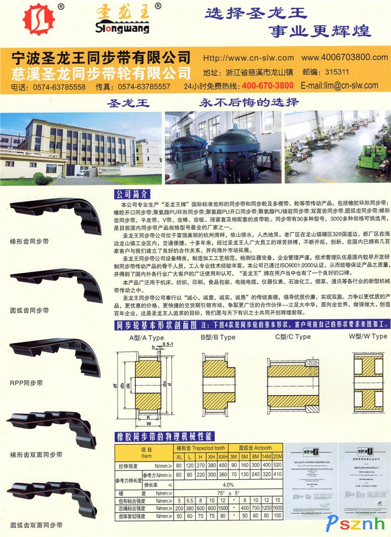 寧波圣龍王同步帶有限公(前身慈溪圣龍同步帶輪有限公司)成立于2002年04月02日,專業(yè)生產(chǎn)“圣龍王牌”國際標(biāo)準(zhǔn)齒形的同步帶和同步輪及多楔帶、輪等帶傳動產(chǎn)品。包括橡膠環(huán)形同步帶;橡膠開口同步帶;聚氨酯PU環(huán)形同步帶;聚氨酯PU開口同步帶;聚氨酯PU接駁同步帶;雙面齒同步帶;圓弧齒同步帶;梯形齒同步帶。平皮帶、V帶、齒棒、齒板、漲緊套及相配套的皮帶輪。同步帶有30多種型號,3000多種規(guī)格可供選用,是目前國內(nèi)同步帶產(chǎn)品規(guī)格型號最全的廠家之一。