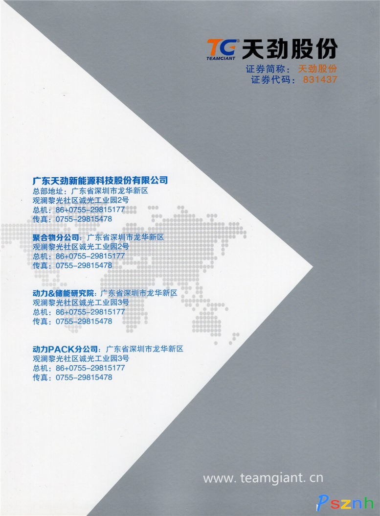 廣東天勁新能源科技股份有限公司(簡(jiǎn)稱天勁股份),創(chuàng)立于2006年9月,是一家專業(yè)提供清潔新能源汽車動(dòng)力電池系統(tǒng)整體解決方案的國家高新技術(shù)企業(yè);旗下?lián)碛猩钲谑刑靹判履茉纯萍加邢薰荆粡V東天勁新能源科技股份有限公司(數(shù)碼)PACK分公司;廣東天勁新能源科技股份有限公司聚合物分公司;動(dòng)力&儲(chǔ)能研究院;動(dòng)力電池PACK分公司等5家分(子)公司。天勁股份于2014年12月8日正式在北京掛牌“新三板”,成功登陸資本圈;證券簡(jiǎn)稱:天勁股份;證券代碼:831437。于2015年7月16日正式做市交易。2015年底,被同行業(yè)以及華南地區(qū)第三方權(quán)威機(jī)構(gòu)-高工產(chǎn)研推薦為“華南聚合物鋰離子動(dòng)力電池領(lǐng)導(dǎo)品牌;2016年7月8日,錄入國家工信部“符合《汽車動(dòng)力蓄電池行業(yè)規(guī)范條件》企業(yè)目錄(第四批)”名錄;8月10日,被列為“廣東省動(dòng)力電池標(biāo)準(zhǔn)化技術(shù)委員會(huì)委員單位”。