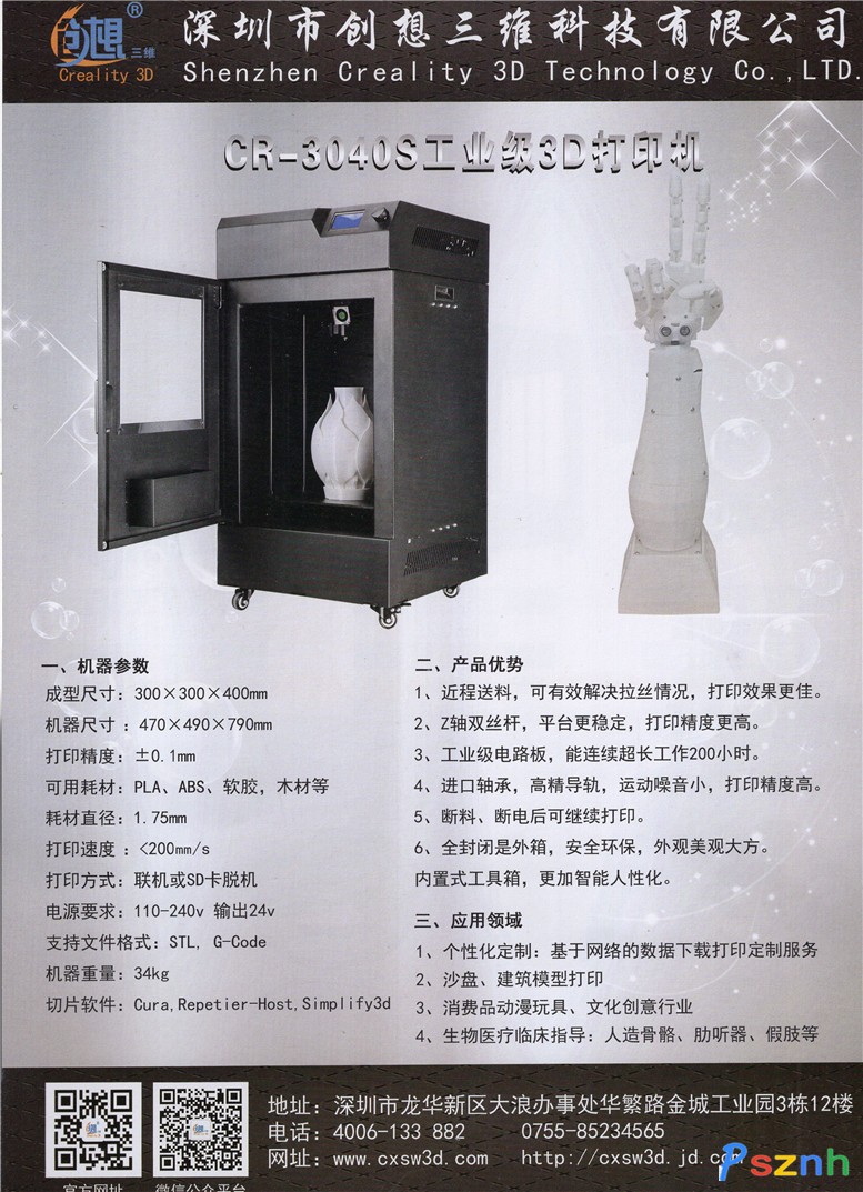 深圳市創(chuàng)想三維科技有限公司成立于2014年,是中國率先進入3D打印行業(yè)的研發(fā)制造商, 致力于建設全方面的3D打印解決方案,業(yè)務領域以3D打印機的研發(fā)、制造、銷售為主,延伸到3D打印配件、3D打印耗材、3D教育課程體系、3D打印打印服務等。目前已成為中國3D打印行業(yè)銷量領先的高新技術企業(yè),研發(fā)實力、生產(chǎn)及品質保證、服務保障 等多方面均處于業(yè)界領先水平。  “品質保證”是‘創(chuàng)想人’驕傲的口碑,讓我們的客戶遍及全球  創(chuàng)想三維投入大量資金建立了大型標準的現(xiàn)代化生產(chǎn)線,年產(chǎn)能達6萬臺。作為從事先進裝備生產(chǎn)的高科技制造型企業(yè),公司具備雄厚的科研基礎和研發(fā)實力,對全系列產(chǎn)品及其工程化開發(fā)流程擁有自主的知識產(chǎn)權,擁有自主知識產(chǎn)權的技術與發(fā)明專利數(shù)十項,產(chǎn)品通過CE、FCC、ROHS等多項國際質量及環(huán)保認證,并遠銷歐洲、美國、澳大利亞、俄羅斯、英國、德國、新加坡、埃及、印度等三十多個國家和地區(qū)。在中國臺灣、香港、上海、北京、四川、湖北、江蘇、山東等十六個省及地區(qū)有授權代理商,創(chuàng)想三維CR-7 mini 3D打印機在知名國外眾籌Kickstarter成功眾籌20萬美元,連續(xù) 保持銷量、口碑領先,獲海內外客戶的高度認可。