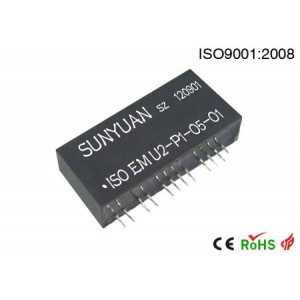 SunYuan ISO EM U-P-O-O電壓輸入系列和ISO EM A-P-O-O電流輸入系列1進(jìn)2出低成本小體積IC封裝的模擬量隔離變送器隔離放大器 ,是一種將(傳感器輸出)單路模擬電壓或電流信號經(jīng)隔離、分配、轉(zhuǎn)換成兩路精度、線性度相匹配的標(biāo)準(zhǔn)模擬信號的混合集成電路。該IC在同一芯片上集成了高隔離的DC/DC分布電源和多組磁電耦合的模擬信號隔離放大器,采用磁電偶合的低成本方案,主要用于對EMC(電磁干擾)無特殊要求的場合。輸入及輸出側(cè)寬爬電距離及內(nèi)部隔離措施使該芯片可達(dá)到電源、信號輸入、兩路信號輸出的3KVDC,四隔離。ISO EM系列單信號輸入雙輸出隔離變送器IC產(chǎn)品使用非常方便,免零點(diǎn)調(diào)節(jié),只需外接增益調(diào)節(jié)電位器,即可實(shí)現(xiàn)工業(yè)現(xiàn)場各種傳感器信號的隔離、分配、轉(zhuǎn)換功能,并能滿足工業(yè)級寬溫度、潮濕、震動等惡劣工作環(huán)境要求。