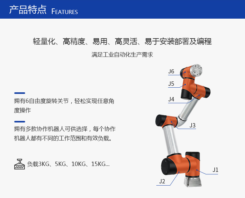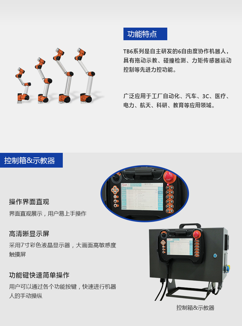 深圳泰科智能TB6系列協(xié)作機(jī)器人是泰科智能自主研發(fā)的6軸輕型協(xié)作機(jī)器人,具有拖動(dòng)示教、安全防碰撞等功能,可以直接與人協(xié)同工作。采用自主設(shè)計(jì)研發(fā)RJSII系列關(guān)節(jié)模組,既輕便靈活、運(yùn)行平滑柔順,同時(shí)滿足負(fù)荷的需求。防護(hù)等級高,可適用于更多苛刻的工作環(huán)境,既有強(qiáng)大的通用性、 協(xié)作性與開放性,廣泛應(yīng)用于物流裝配、流水線生產(chǎn)、上下料、AGV、3C電子、科研、醫(yī)療等行業(yè)領(lǐng)域。安裝簡單(安裝方式任意角度)及用途多樣化,提升產(chǎn)品品質(zhì)和生產(chǎn)效率,并更好的節(jié)約人工成本。