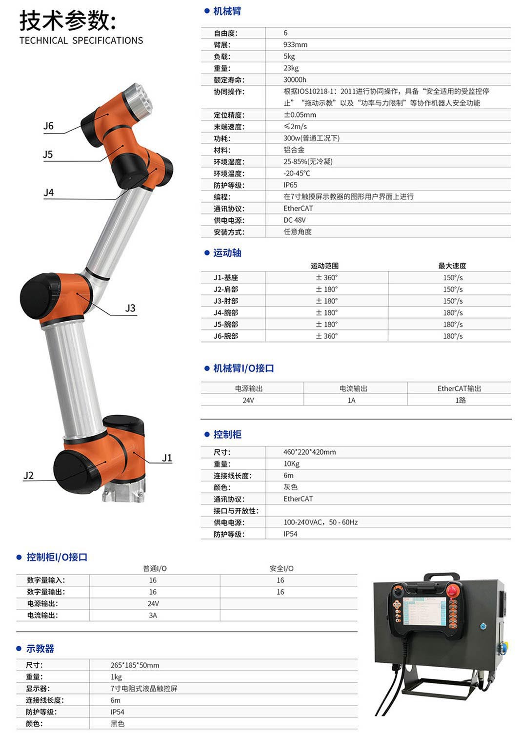 深圳泰科智能TB6-R5協(xié)作機(jī)器人是一款靈活的輕型工業(yè)協(xié)作機(jī)器人,具有精巧的機(jī)械結(jié)構(gòu)設(shè)計(jì)。這款協(xié)作機(jī)器人有效負(fù)載為5KG,自重僅為23KG,重復(fù)定位精度可達(dá)±0.05mm,適應(yīng)多樣性、柔性生產(chǎn)應(yīng)用需求。模塊化關(guān)節(jié)設(shè)計(jì),使關(guān)節(jié)模組拆卸及更換更快捷,易于安裝及維護(hù)。擁有輕量化、用途廣泛、易于使用的特點(diǎn),旨在幫助企業(yè)提高經(jīng)濟(jì)效益。