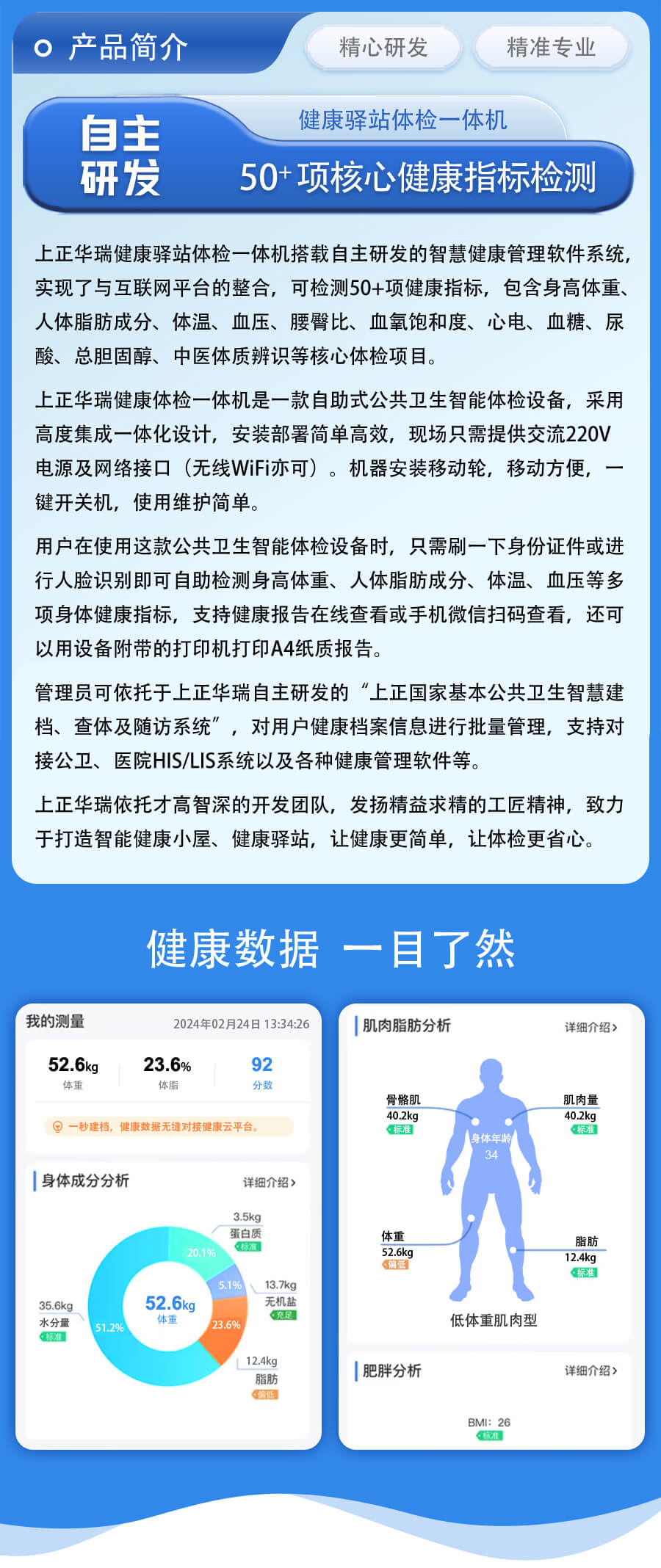 其次,上正華瑞健康驛站體檢一體機(jī)采用了先進(jìn)的傳感器技術(shù)和算法,確保了測量的準(zhǔn)確性。這使得居民能夠獲取到更為可靠的健康數(shù)據(jù),為醫(yī)生的診斷和治療提供了有力依據(jù)。